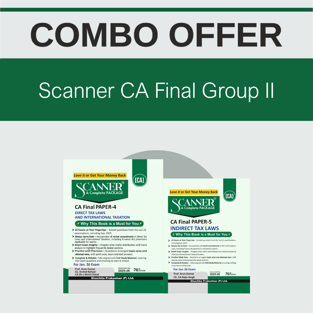 The CA Final Group 2 Scanner Combo by Shuchita Prakashan covers Direct Tax Laws & International Taxation and Indirect Tax Laws. This 2-in-1 set is smarter than a question bank—offering ICAI-aligned solved papers, amendments, and trend analysis tools to help you prepare strategically for CA Final exams.